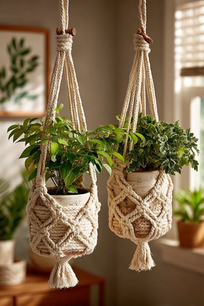 Want to add a touch of nature without cluttering your surfaces? Hanging macramé holders are a stylish way to introduce greenery, even if you’re short on space. They bring a boho vibe and a dash of freshness, making your home feel alive and inviting. Plus, they’re pretty easy to make and customize.