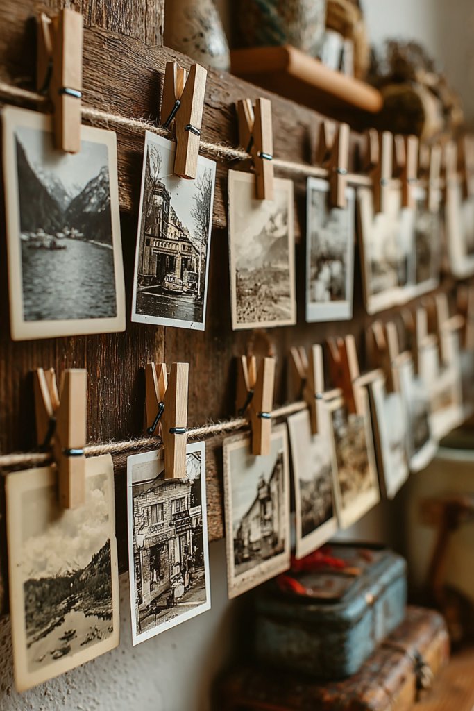 Picture a length of twine or wire stretched across a wall, adorned with clipped photos, postcards, or artwork. Small clothespins or clips hold each item, allowing for easy updates. The photos hang loosely, creating a casual, playful vibe. The mix of images, colors, and textures makes the wall feel warm and personal, like a visual scrapbook.