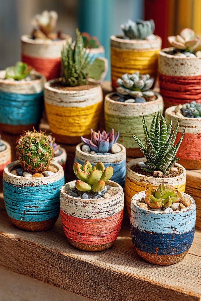 Picture small terracotta pots painted in vibrant hues, with patterns like stripes, polka dots, or even intricate designs. They sit on shelves, desks, or windowsills, adding cheerful accents to your decor. The matte finish of the clay combined with glossy paint creates a lovely contrast. These colorful pots turn simple storage into decorative statements that catch the eye.