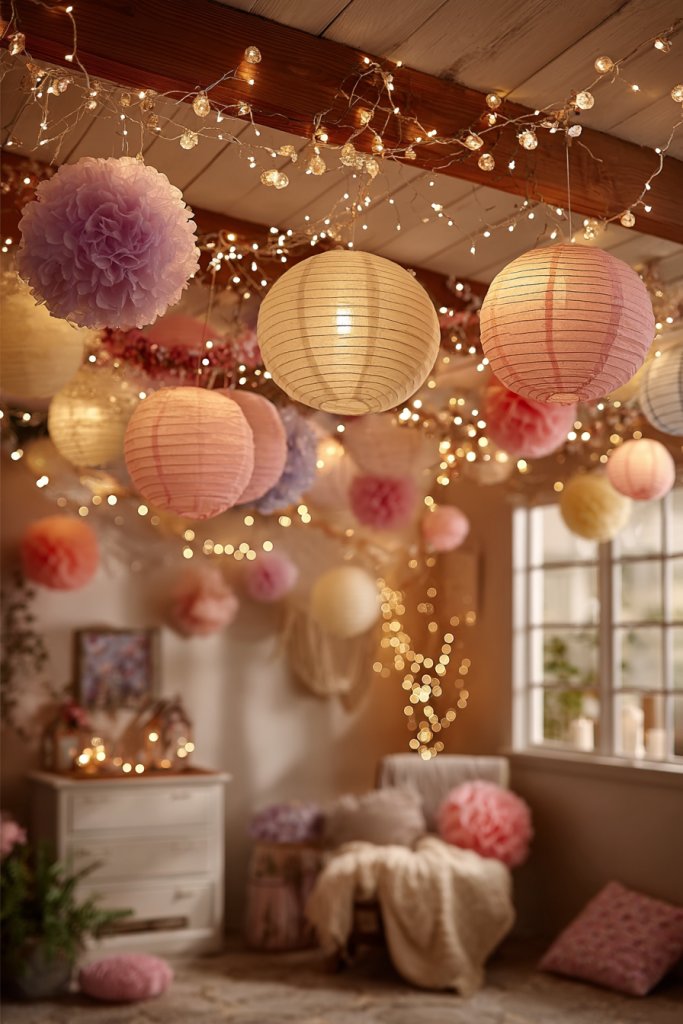 Picture delicate string lights hung across a ceiling, with soft fabric or paper lantern covers draped over each bulb. The covers diffuse the light, creating a warm, inviting glow. The varied shapes and textures—like ruffled fabric or patterned paper—add depth and interest. It’s a simple upgrade that turns plain string lights into a focal point.