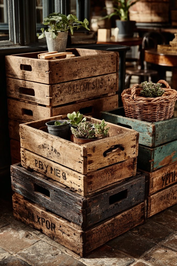14. Reclaimed Wooden Crates as Stylish Storage Solutions