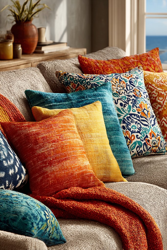 15. Colorful Patterned Pillows and Throws