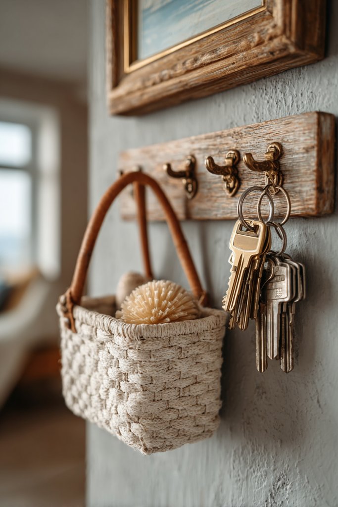 Imagine tiny woven or metal baskets suspended from hooks or a decorative board, holding your keys, rings, or bracelets. The baskets add texture and visual interest, especially when paired with a mirror or framed art. The arrangement is both functional and charming, making your space feel tidy and curated. It’s a simple addition that makes a big difference.