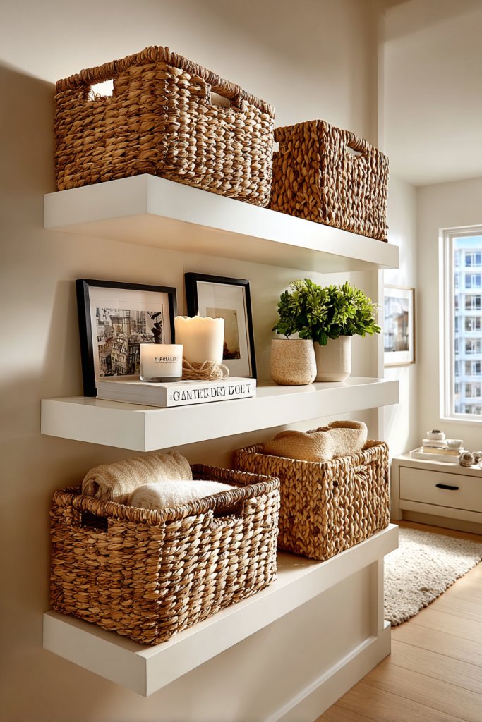 Imagine thin, matte-finished floating shelves mounted against a painted wall, each holding neatly folded fabrics, candles, or small decorative items. Below or beside, woven baskets add texture and warmth while hiding away everything from remote controls to chargers. The combination of smooth shelves and textured baskets creates a balanced, layered look that feels both modern and inviting. It’s like a tidy little boutique in your own home.