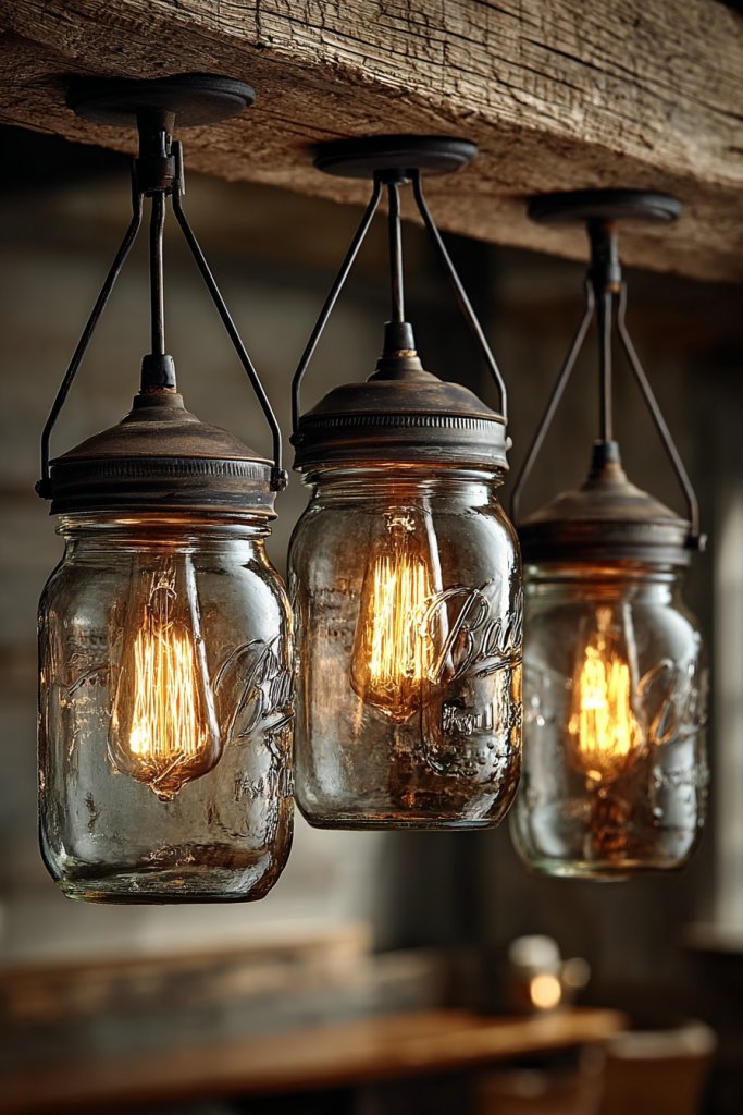 Picture a row of mason jars hanging from a reclaimed wood beam, each filled with fairy lights or candles. The jars diffuse the warm glow, creating a soft, inviting atmosphere. You can even add decorative accents like twine, lace, or paint the lids for extra flair. The combination of rustic glass and warm light instantly adds charm and personality to any room.