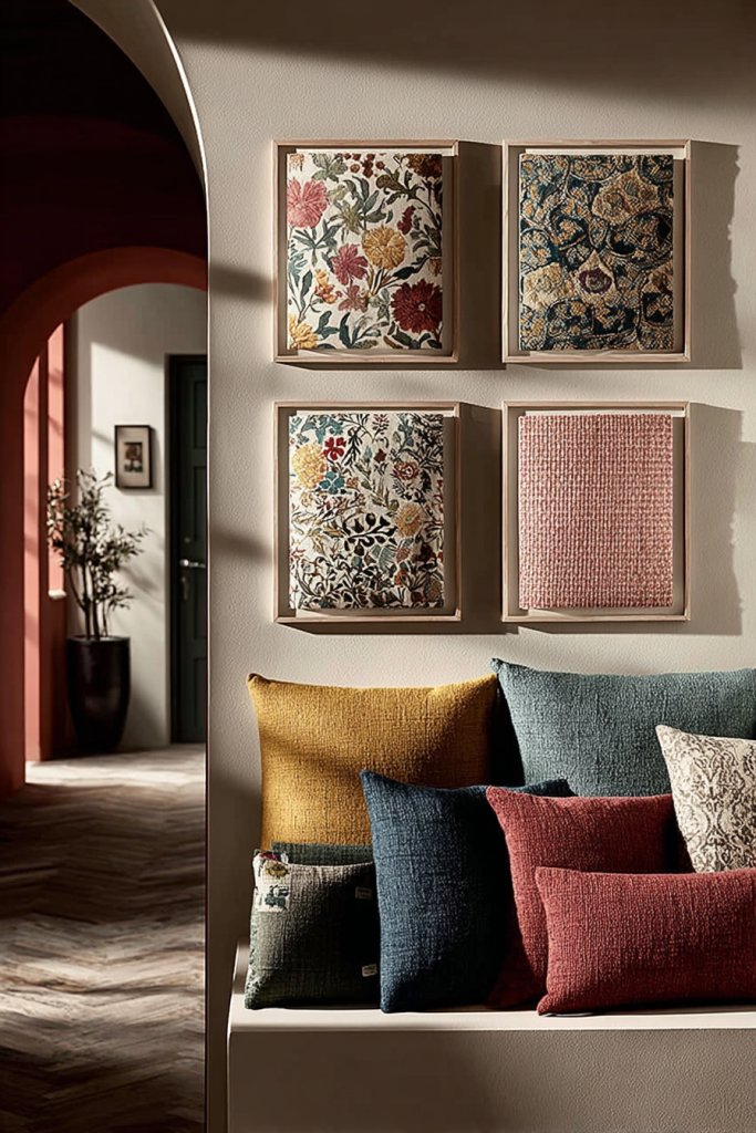 Imagine a wall filled with framed swatches—each showcasing bold florals, abstract designs, or subtle textures. The frames, in various finishes, add a polished look while highlighting the patterns inside. Mixing different sizes and orientations creates an eclectic, curated vibe. The textures and colors pop, making your wall a stunning focal point that sparks conversations.
