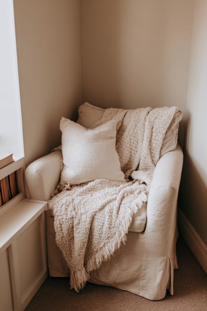 Imagine sinking into a plush armchair draped with a soft, textured throw, nestled beside a compact side table holding your favorite mug. Layered cushions with varying fabrics add tactile warmth, inviting you to relax. The cozy corner is illuminated softly by warm ambient lighting, creating an intimate glow. It’s a space that beckons you to unwind after a hectic day.