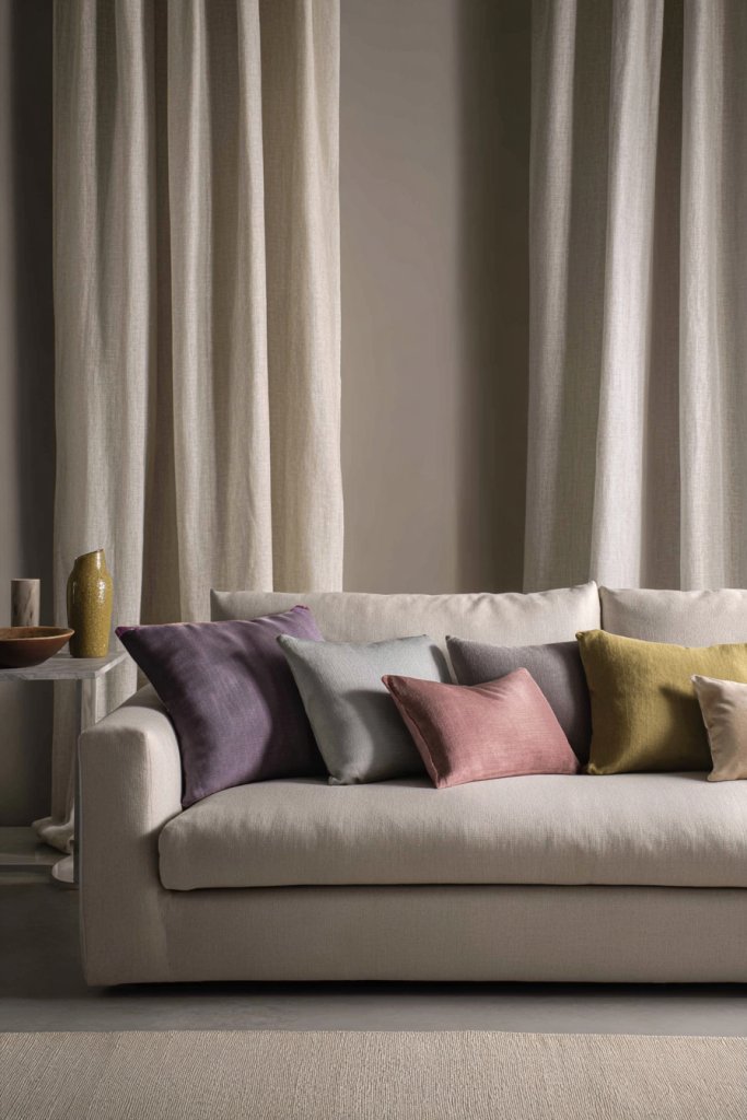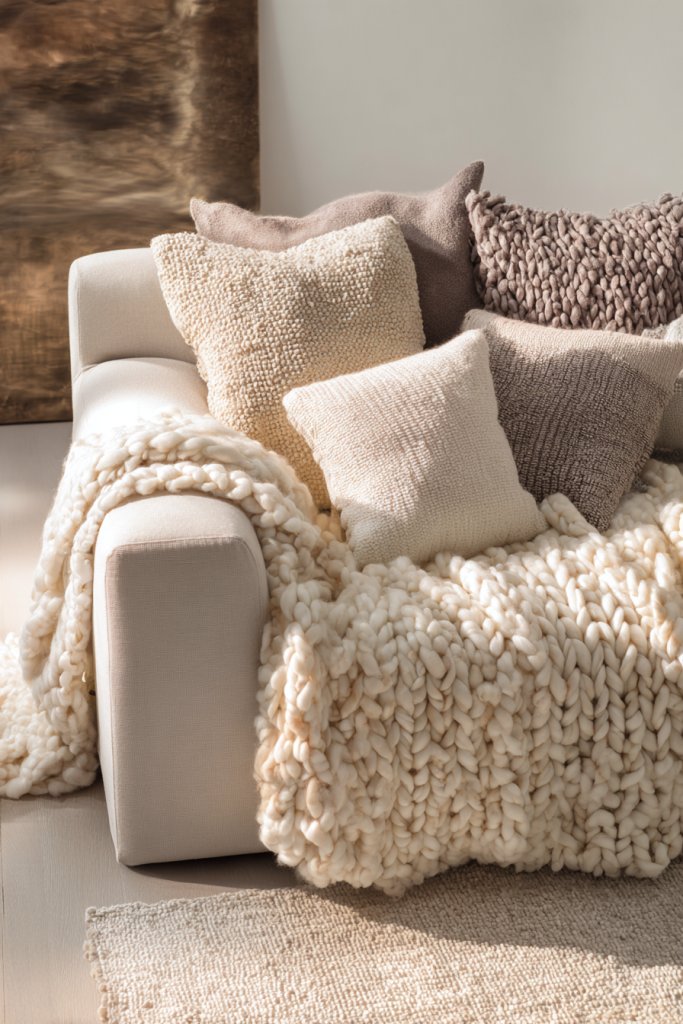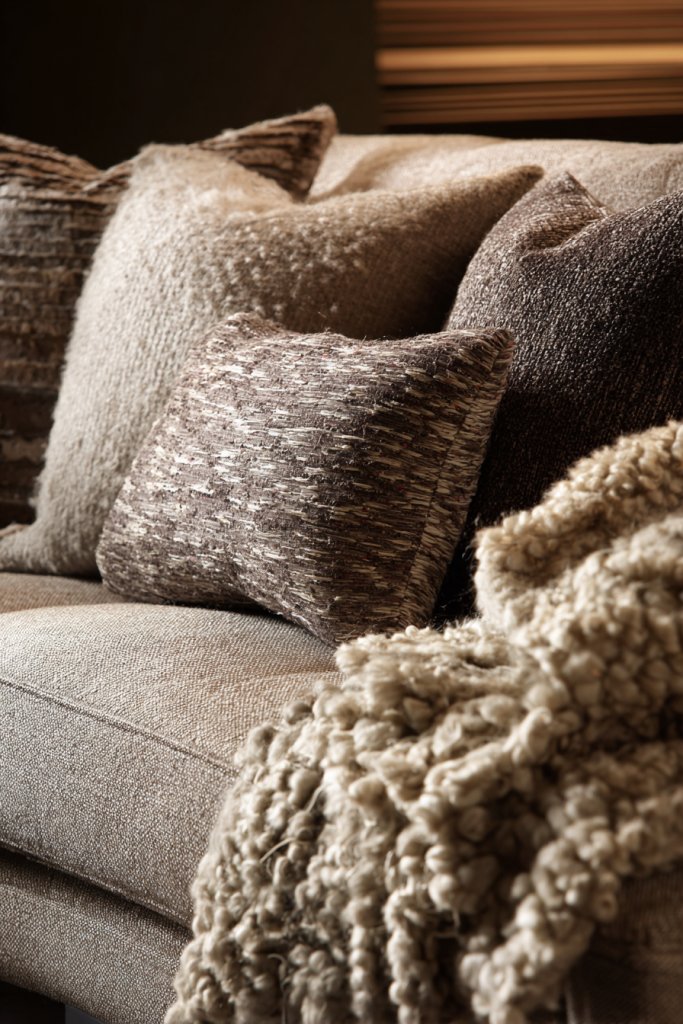 Picture a sofa adorned with cushions in varying sizes, fabrics, and patterns—think velvet, linen, and woven textures—that complement a soft throw blanket draped casually over the arm. The layers create visual depth and invite you to sink in. The combination of colors and textures adds personality and warmth, making your living room feel like a curated retreat. The tactile appeal of the layered textiles encourages touch and relaxation.