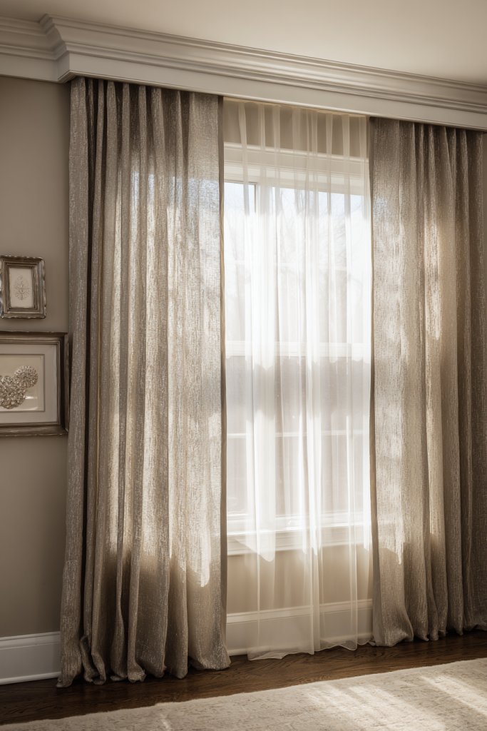 Visualize sheer curtains filtering soft daylight, paired with heavier, textured drapes in a complementary color. When closed, they block out light and add a sense of enclosure; when open, they let in natural rays. The layers add depth and texture to your windows, turning them into a design feature. The fabric choices, patterns, and colors work together to create a harmonious look.
