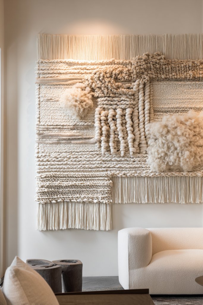 Picture woven wall hangings with fringes, textured tapestries with embossed patterns, or fabric art with layered materials. These pieces create a sense of movement and dimension, catching light and shadows in interesting ways. They add warmth and personality, making the room feel curated and layered. The tactile quality invites touch and exploration, making your space multi-sensory.
