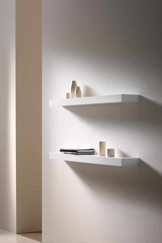 Picture a set of slim, matte-finished floating shelves mounted high on a wall, holding a curated collection of colorful ceramics, candles, and tiny sculptures. They stretch across the wall, creating a visual line that guides your eye. The clean lines contrast beautifully with textured wall paint or wallpaper, adding depth. The shelves seem to float effortlessly, giving the room a modern, airy feel.