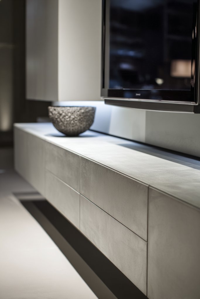 Imagine a low-profile media console with a smooth finish, featuring concealed drawers and cabinets. Electronics are tucked away behind sliding doors or inside compartments, leaving only a minimalist surface visible. The unit’s clean lines blend seamlessly with modern decor, while hidden compartments hide away remotes, cables, and gadgets. The result: a clutter-free, streamlined look that feels calm and intentional.