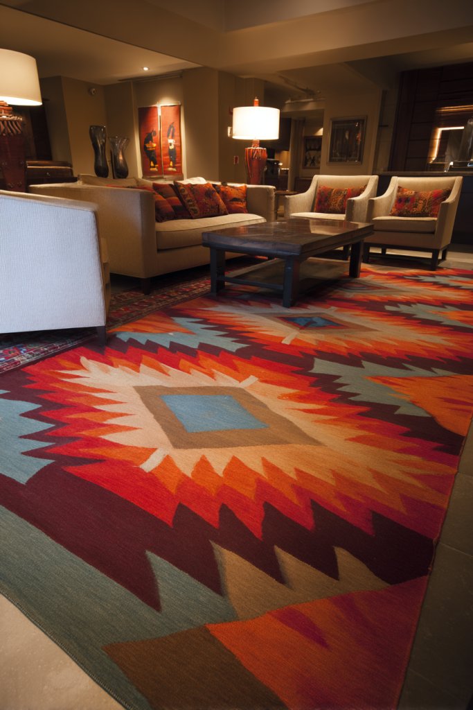 Picture a large, plush rug in a vibrant pattern or rich texture, sprawling under your sofa and chairs. It adds warmth and color, transforming a plain floor into a focal point. The tactile surface invites you to kick off your shoes and relax. The pattern complements your decor, tying together different elements for a cohesive look. It’s a visual anchor that pulls the room together.