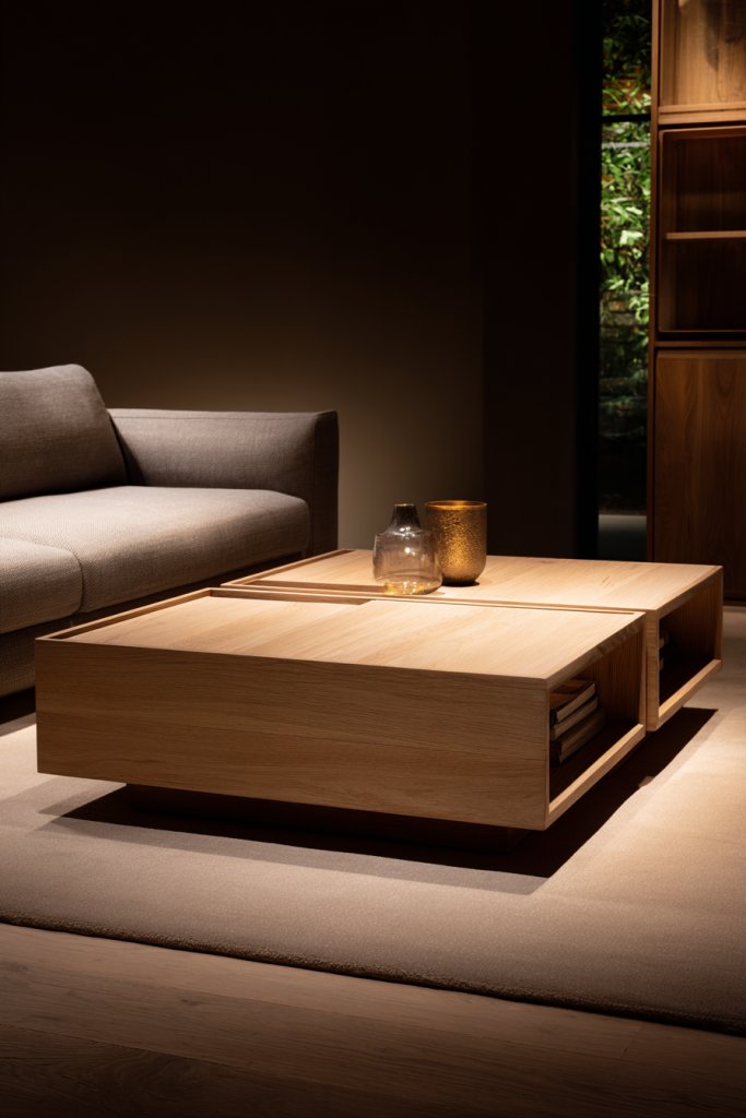 Imagine a sleek coffee table with a lift-top lid or hidden drawers that store magazines, remote controls, and chargers. The surface remains clean and organized, with a smooth finish that complements your decor. When needed, the table transforms into a workspace or dining area. Its minimalist design adds a modern touch, while hidden compartments keep the room looking uncluttered.