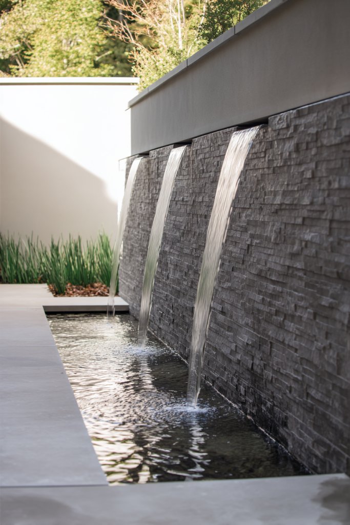 Envision a sleek, wall-mounted water feature with water cascading gently over textured surfaces or layered stones. The sound of flowing water masks noise from neighbors or traffic, creating an auditory buffer. Soft lighting highlights the movement, making the feature glow warmly after sunset. Its minimalist design complements modern or Zen-inspired landscapes.