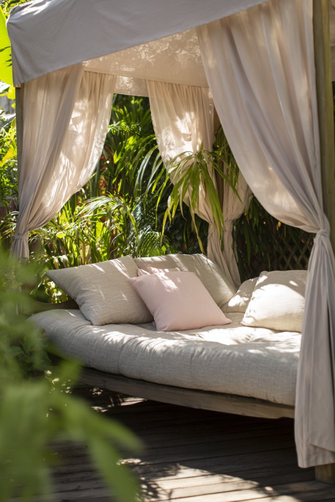 Imagine a large, cushioned daybed draped with a light, airy canopy or curtains that flutter gently in the breeze. The frame is weather-resistant, with soft pillows and throws piled on top. It’s nestled among your garden’s natural elements, inviting you to sink in with a good book or a glass of iced tea. The canopy offers privacy and shade, transforming your yard into a luxurious getaway.
