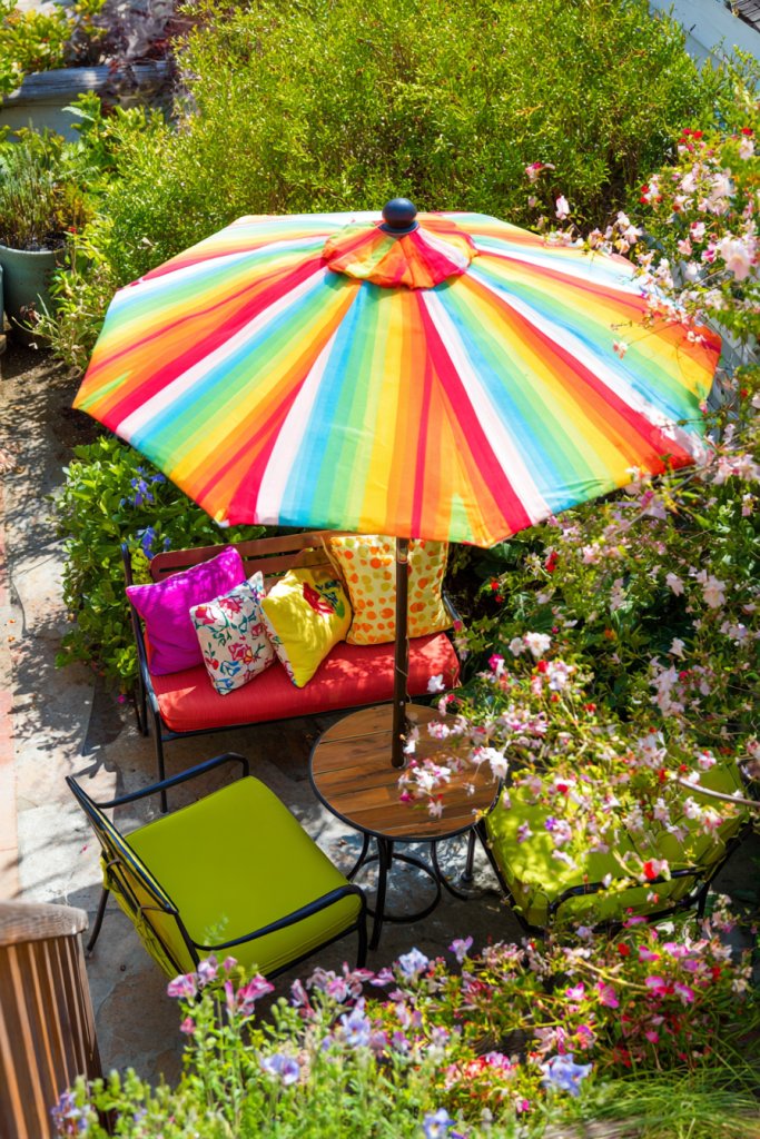 13. Colorful Garden Umbrella and Cozy Seating