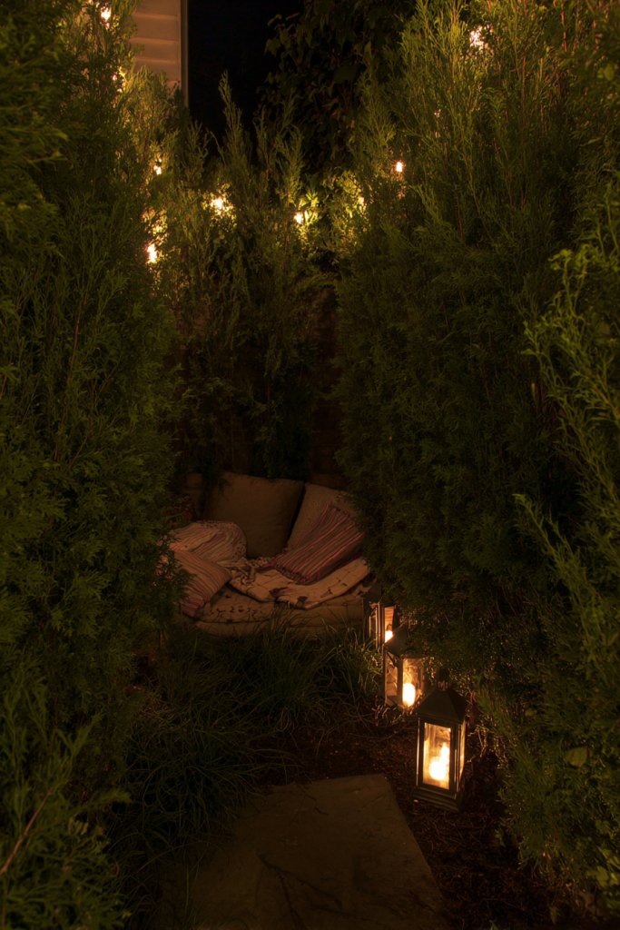 14. Hidden Nook with Tall Shrubs and Soft Lighting