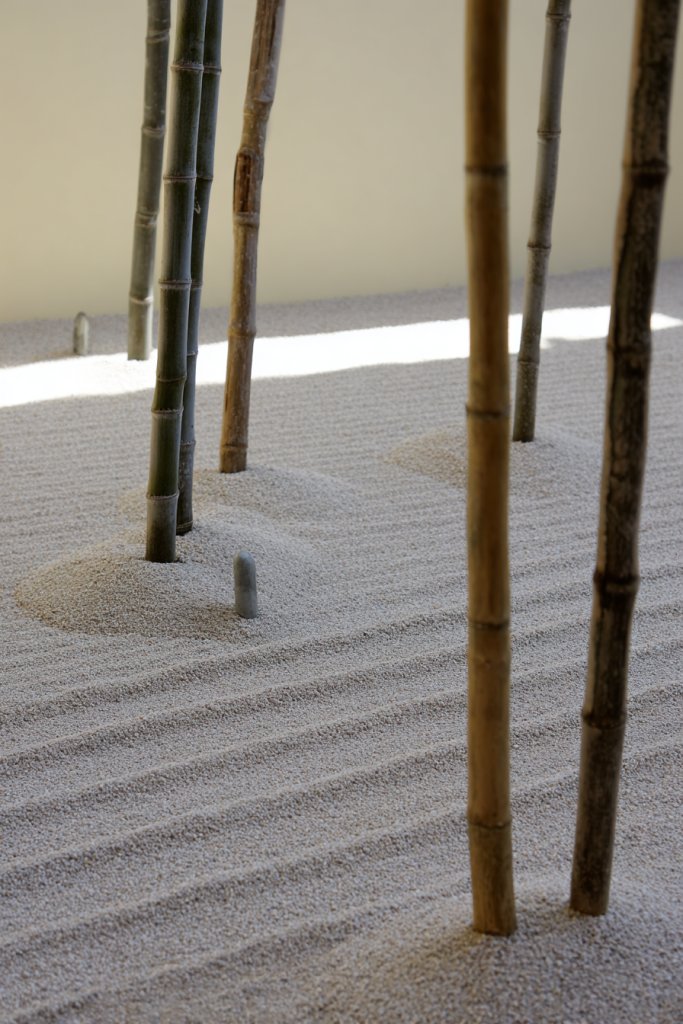 Imagine a small, meticulously raked gravel area, bordered by slender bamboo fencing or accents. The fine gravel or sand forms patterns, inviting your gaze to follow calming lines. A few smooth stones or a simple sculpture add focal points without overwhelming the senses. The overall look is clean, balanced, and soothing—a true reflection of Zen principles.