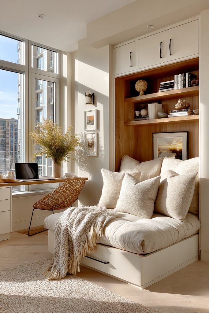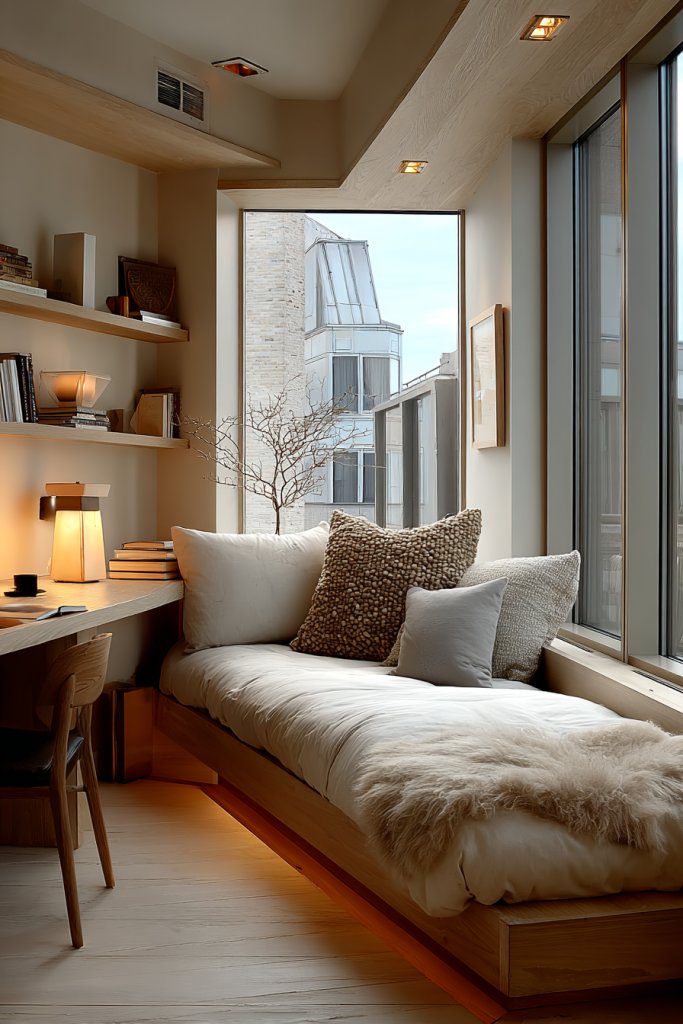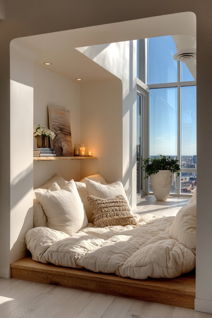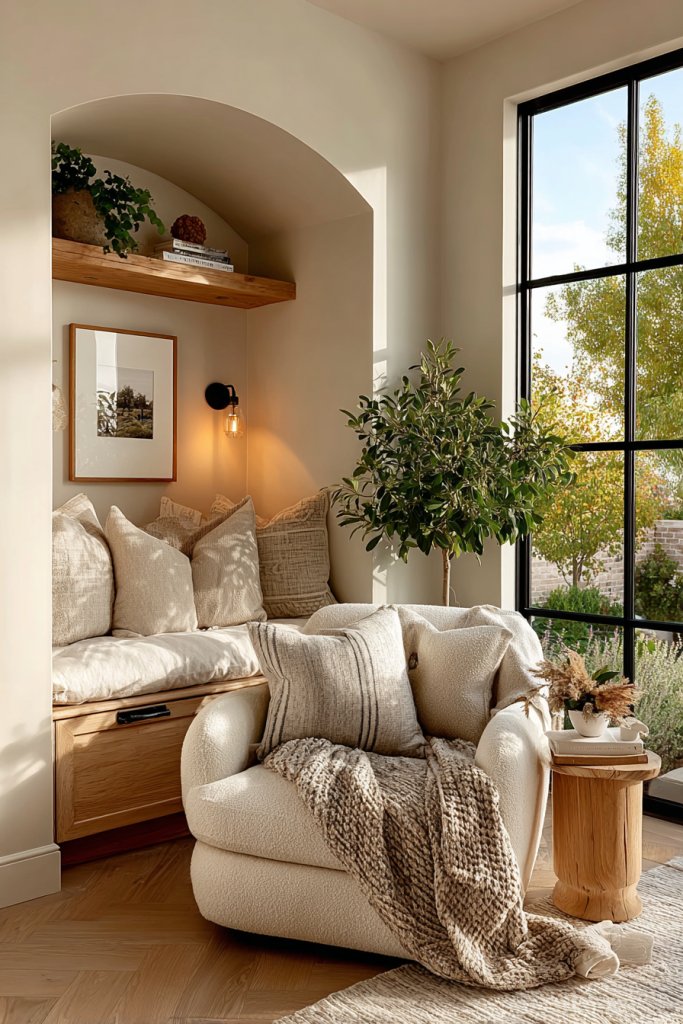 Visualize a snug corner with a small armchair or a plush window seat, topped with cushions in your favorite fabrics. A compact side table or a floating shelf nearby holds essentials like a cup of tea or a notebook. Soft lighting, such as a wall-mounted sconce or a portable lamp, creates a warm glow. Textured textiles and a few decorative accents complete the inviting vibe—making it your personal sanctuary.