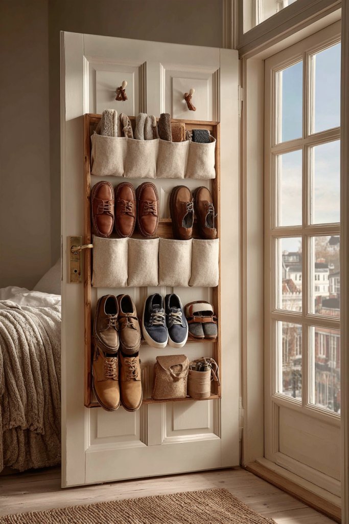 Visualize sturdy hooks or pockets hanging on the back of your door, holding shoes or accessories neatly organized. An over-door rack with multiple compartments can store scarves, hats, or small bags. The door becomes a functional display area that’s out of sight when closed. This simple addition keeps your room tidy and maximizes every inch of available space.