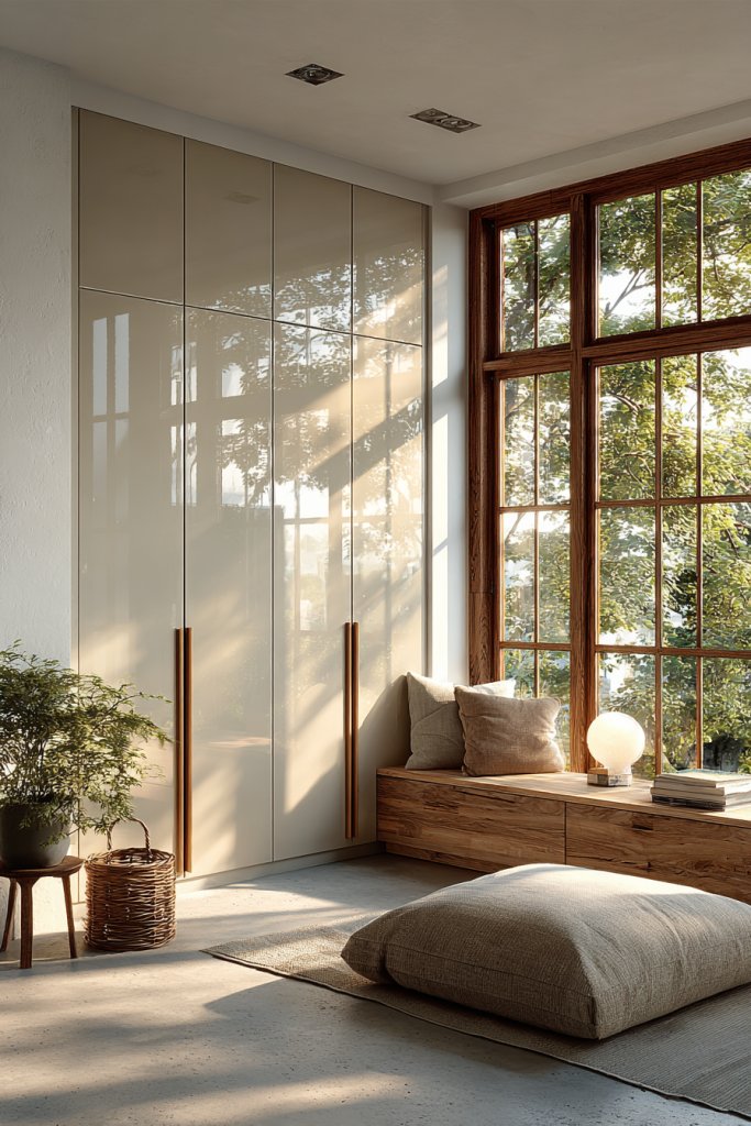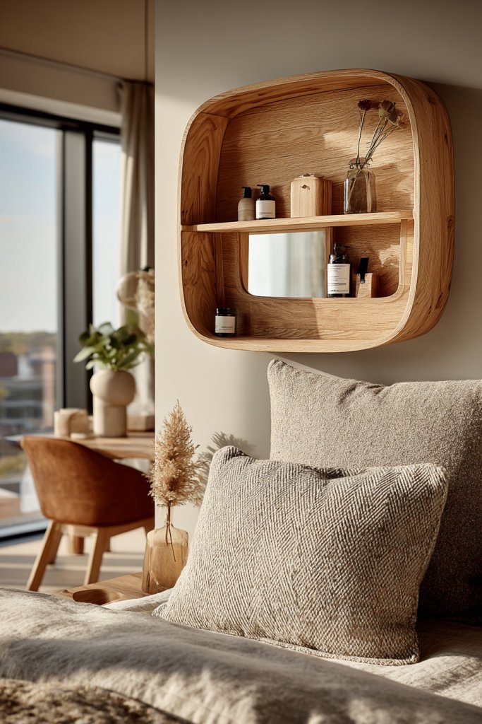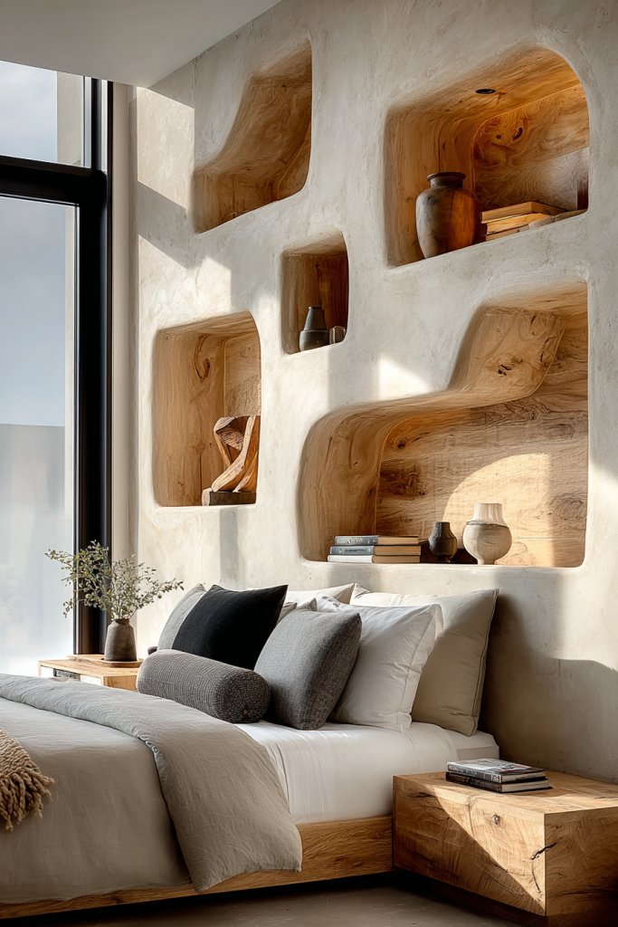 Visualize custom wall niches with shelves for folded clothes or decorative boxes, seamlessly blending into your room’s design. Think of a recessed cabinet with hidden doors for out-of-season items, creating a clean, uncluttered look. The room’s walls become both storage and design elements, with clean lines and hidden surprises. This approach makes your space look polished and thoughtfully designed.