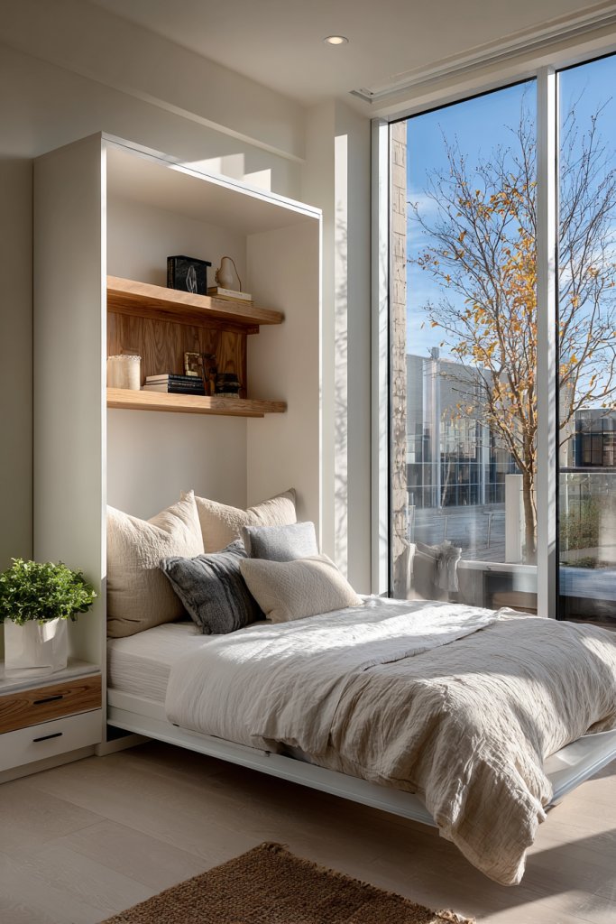A wall-mounted bed is a game changer for maximizing space without sacrificing comfort. It’s perfect for guest rooms, studio apartments, or multi-purpose rooms. The clean, modern look adds a touch of sophistication and flexibility. With this setup, your space adapts effortlessly to your lifestyle, making every inch count and proving that small can be mighty.