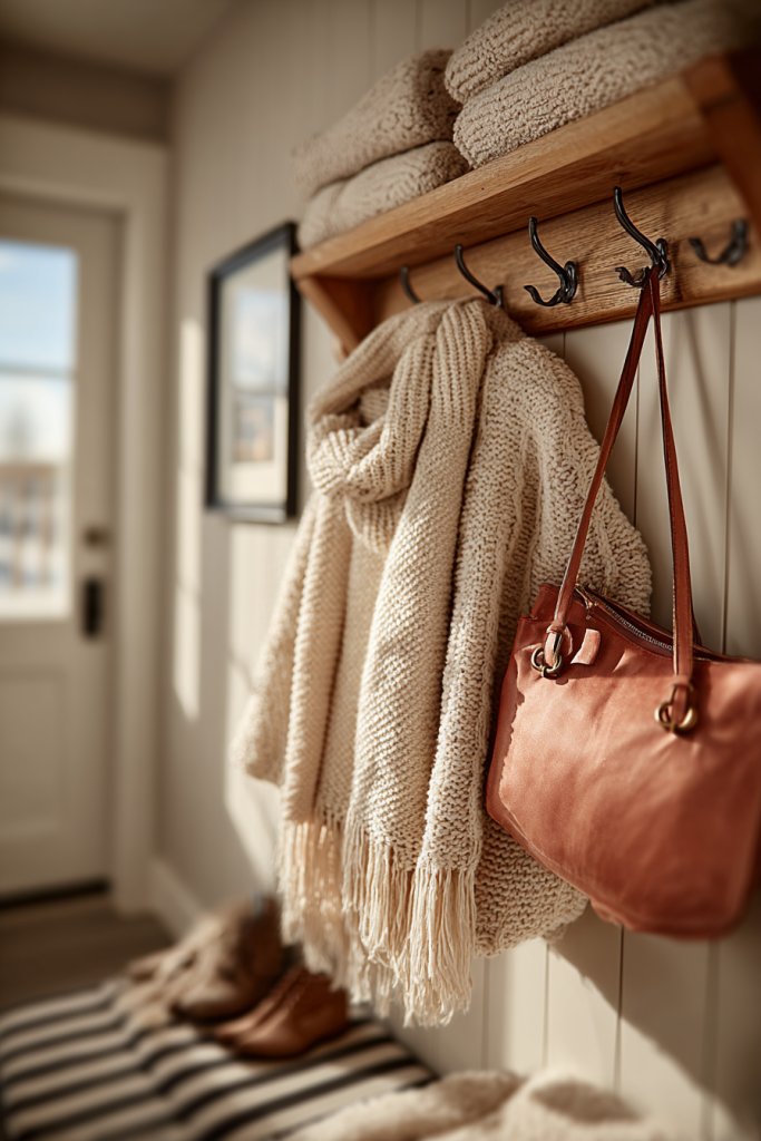 Imagine sleek hooks suspended from the ceiling or mounted on the ceiling beam, holding lightweight baskets or hanging organizers. These can store scarves, jewelry, or even seasonal clothing in a visually appealing way. The room feels more open and less crowded, with items displayed artfully overhead. It’s a functional, stylish upgrade that keeps clutter off your surfaces.