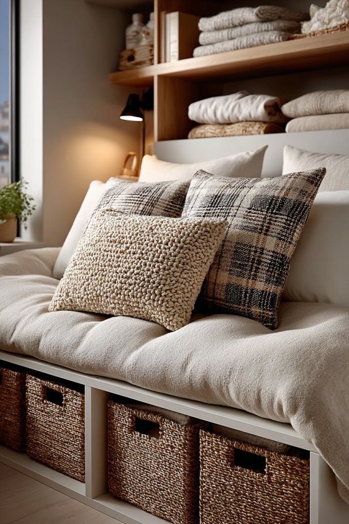 Decorate storage bins with fabric covers or adhesive labels that match your decor. Use color-coded bins for different categories—like one for summer clothes and another for holiday decorations. Incorporate soft textiles like a plush rug or throw to make the area feel cozy. When not in use, keep the bins tidy and avoid overstuffing to maintain a sleek look.