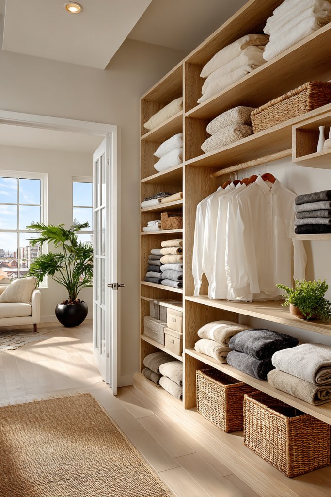 Imagine a closet with tiered shelves for shoes, hanging dividers for accessories, and adjustable rods for different lengths of clothing. Visualize clear bins stacked neatly with labels, and a pull-out drawer system for smaller items. The closet looks like a boutique display—everything has its spot, and nothing feels out of place. The space is maximized, and your morning routine becomes smoother.