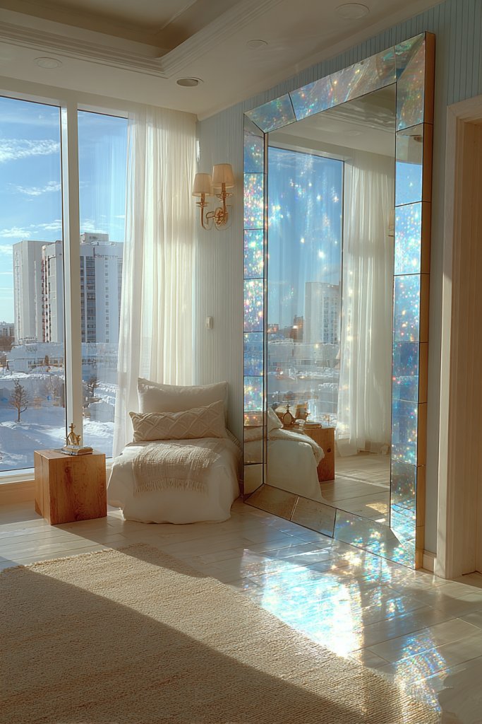 Add decorative throw pillows or bedding in light, harmonious hues. Incorporate metallic or mirrored accents in picture frames, hardware, or decorative accessories. Use sheer curtains or minimal window coverings to allow maximum natural light in. Personalize with subtle patterns or textures that complement the overall bright aesthetic. This approach keeps your space feeling fresh and spacious.