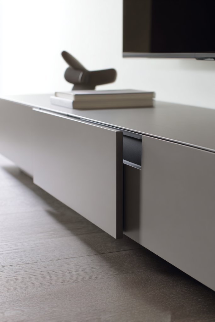 Picture a low-profile TV unit with push-to-open doors, seamlessly blending into the wall. Hidden drawers or cabinets beneath a floating bench keep everything out of sight. The minimalist design emphasizes smooth surfaces and subtle handles or finger pulls. The overall look is clean, calm, and free of visual noise.