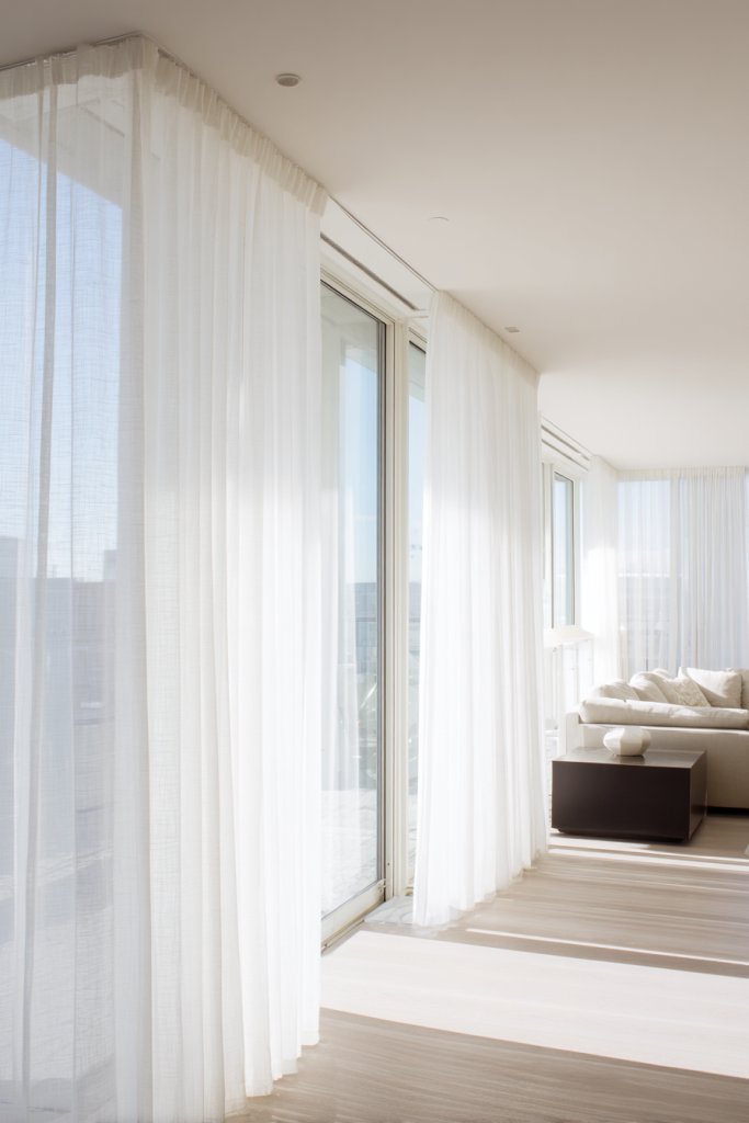 Imagine expansive glass panes stretching from floor to ceiling, with lightweight, sheer curtains that softly diffuse daylight. The minimal fabric adds elegance without blocking views or light. The room feels airy and connected to the outdoors, while the clean lines of the windows create a modern architectural statement. The natural scenery becomes part of your decor.