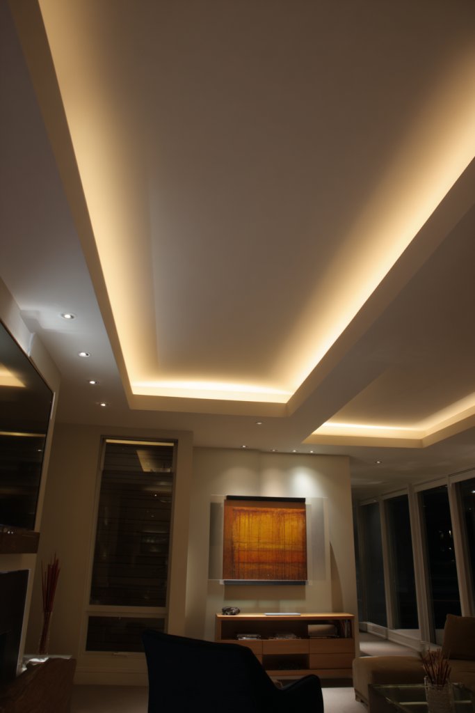 Imagine a space where soft, recessed ceiling lights cast gentle pools of light, highlighting architectural features and creating depth. Accent lights subtly illuminate textured wall panels or sculptural decor, adding visual intrigue. The combination results in a layered, multidimensional ambiance that adapts to mood and activity. Warm light from hidden fixtures bounces off neutral walls, filling the room with a welcoming radiance. It’s like creating a picture frame around your living space.
