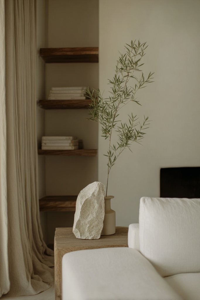 Picture a smooth stone sculpture nestled on a sleek console, or a small bamboo side table with a matte finish. Textured wool or linen throws drape over a sofa, inviting touch and comfort. Natural materials like wood, stone, and textiles in muted tones create a layered, peaceful aesthetic. These elements subtly evoke the outdoors and make your living space more inviting.