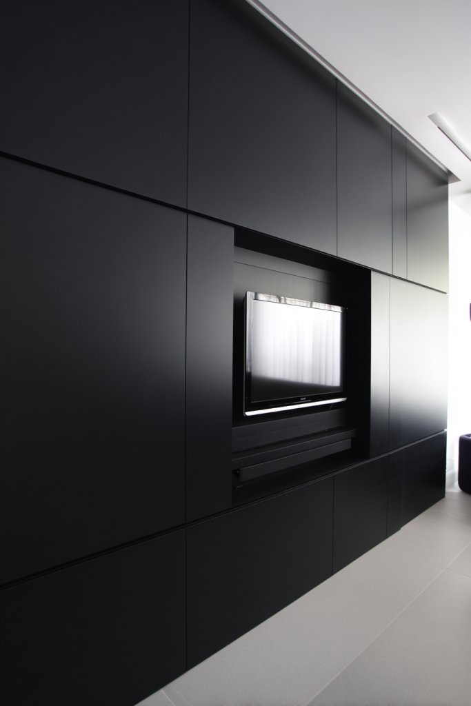 Imagine a custom-built, flush-mounted media panel that conceals all electronic components behind sleek doors. A low-profile cabinet with integrated charging stations and cable management keeps everything tidy. The room feels spacious, with no visual clutter—just clean lines and hidden technology. Subtle LED lighting accents highlight the design, adding a futuristic touch.