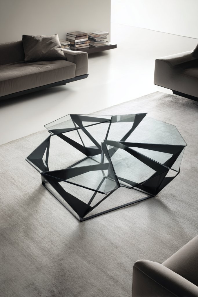 Visualize a coffee table with sharp angles and clean lines made from brushed metal, polished wood, or acrylic. The geometric design creates a sculptural effect, drawing the eye immediately. Surround it with minimalist seating and soft textiles to let the table stand out. The contrast of materials and shapes adds depth and visual interest.