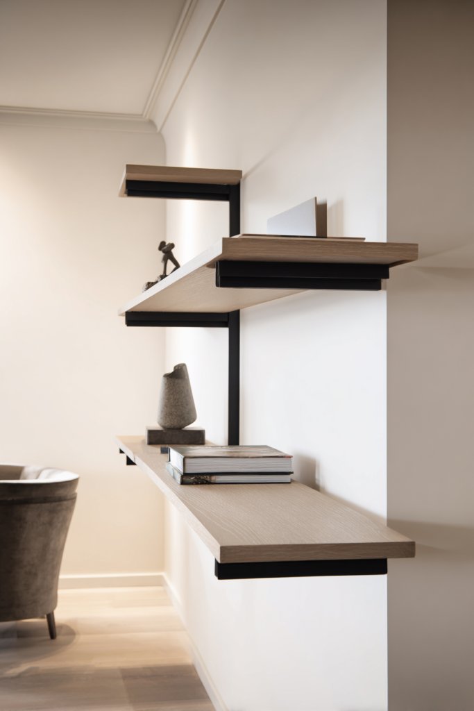 Imagine slim, matte black or wood-finished shelves mounted seamlessly onto a wall. They display curated objects like books, candles, or decorative bowls, creating a layered visual effect. The open design keeps the room feeling airy, while the strategic placement adds depth. Soft lighting underneath or above the shelves highlights your display and adds warmth.