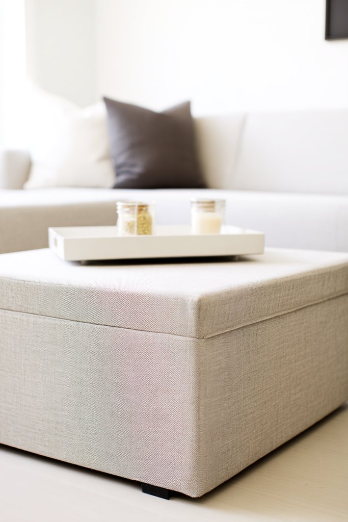 Picture a soft, upholstered ottoman in a neutral fabric with a hinged lid that reveals ample storage space inside. It doubles as a coffee table, topped with a tray or decorative object. Surround it with layered textiles and sleek seating to create a cozy, inviting atmosphere. Its simple silhouette fits seamlessly into various decor styles.