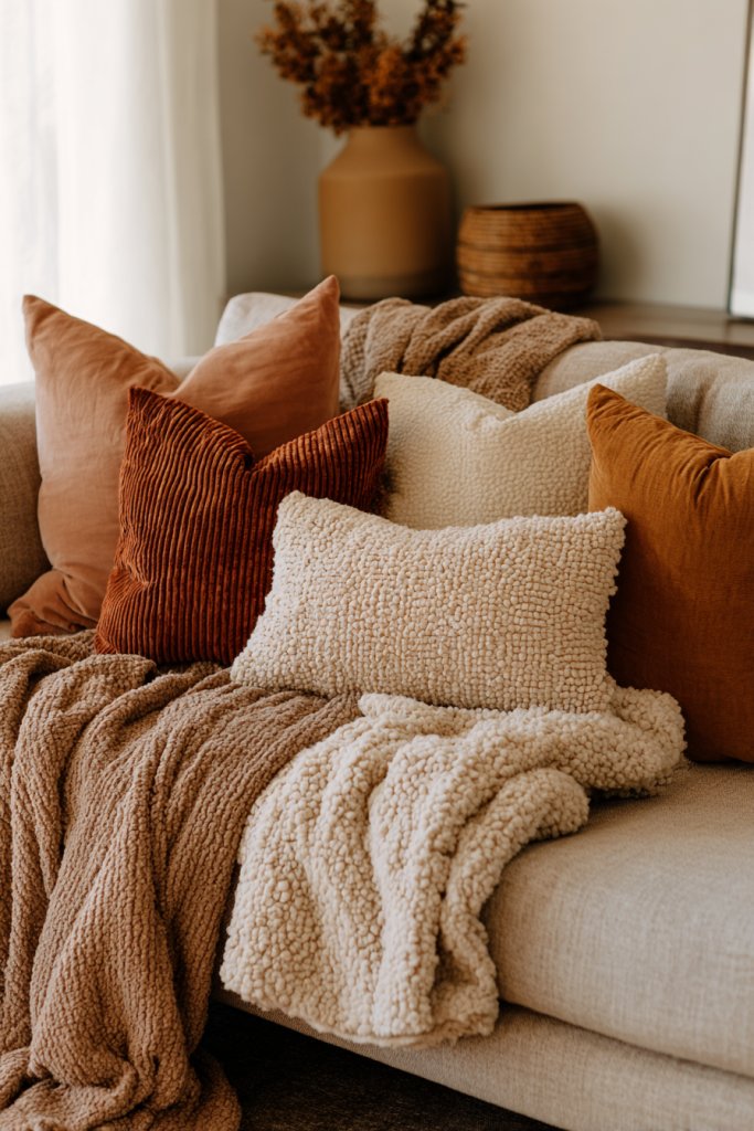 1. Layered Textiles with Plush Throw Blankets and Cushions