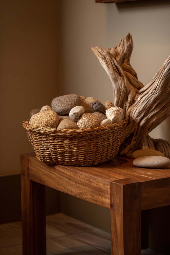12. Incorporate Natural Elements with Driftwood, Stones, or Wicker Baskets