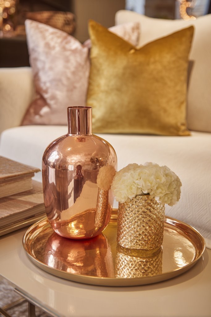 Picture a copper tray on a coffee table, holding textured candles and small decorative objects. A bronze picture frame or lamp base adds a hint of shine that catches the light warmly. These accents create visual interest, elevating simple decor with a touch of luxe. The metallic’s warm undertones complement textiles and wood, resulting in a harmonious, inviting space.