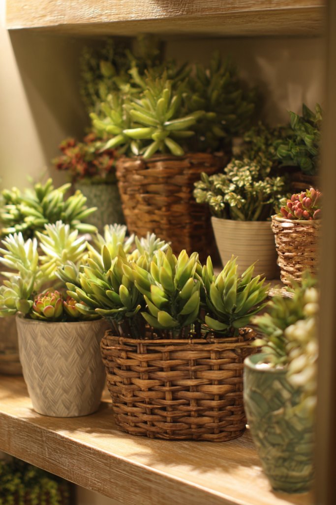 Imagine a shelf lined with realistic faux succulents and air plants in textured ceramic pots. Lush, low-maintenance greenery can also be placed in wicker or wooden planters, adding earthy warmth. The subtle greenery breaks up neutral tones and adds a calming, natural element. When arranged thoughtfully, it creates a miniature oasis that requires minimal care.