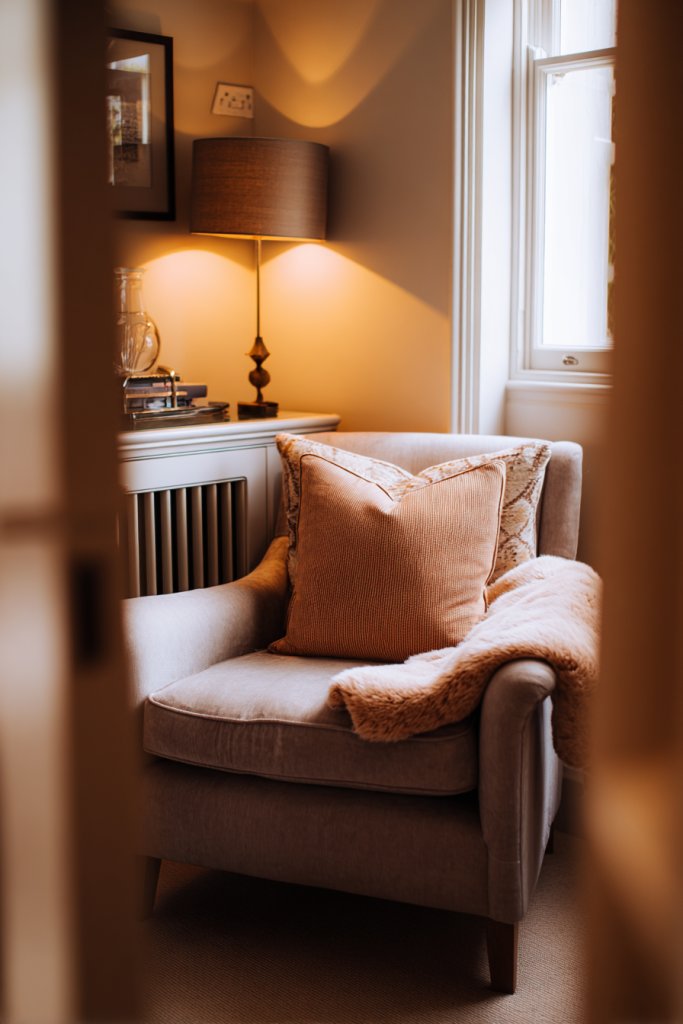 Picture a small corner with a plush armchair or window seat, layered with cushions and a soft throw. A side table holds your favorite book or a hot cup of tea, while soft lighting casts a warm glow. The space is tailored for comfort—think textured fabrics, warm colors, and personal touches like a small decorative pillow or a cozy blanket. It’s your personal retreat, perfect for quiet mornings or lazy evenings.