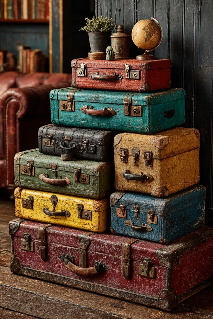 Picture a stack of colorful, patterned vintage suitcases forming a side table or coffee table. Or a series of distressed trunks arranged along a wall, doubling as storage and display. Each piece tells a story—vintage travel, family heirlooms, or thrift store finds—adding character and history. The varied shapes, sizes, and colors create a lively, curated display that invites exploration.