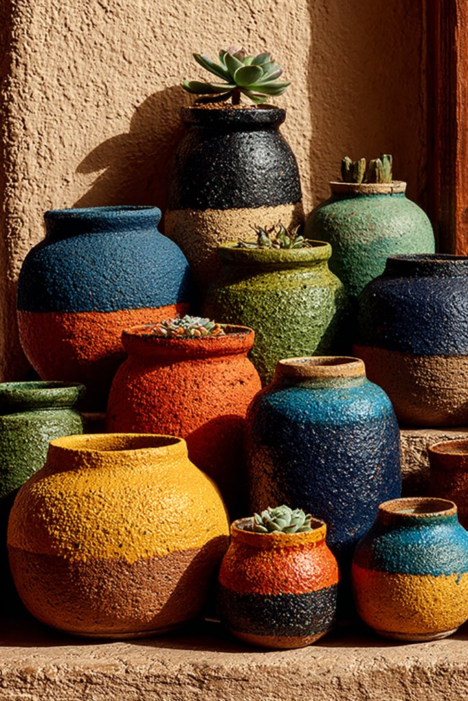 Imagine a row of colorful, handmade pots in various shapes and sizes arranged on open shelves. Or a collection of glazed bowls and vases layered on a coffee table or sideboard. The uneven textures and rich glazes add depth and tactile appeal. The varied colors and forms create a lively, curated gallery that adds personality and warmth to your space.