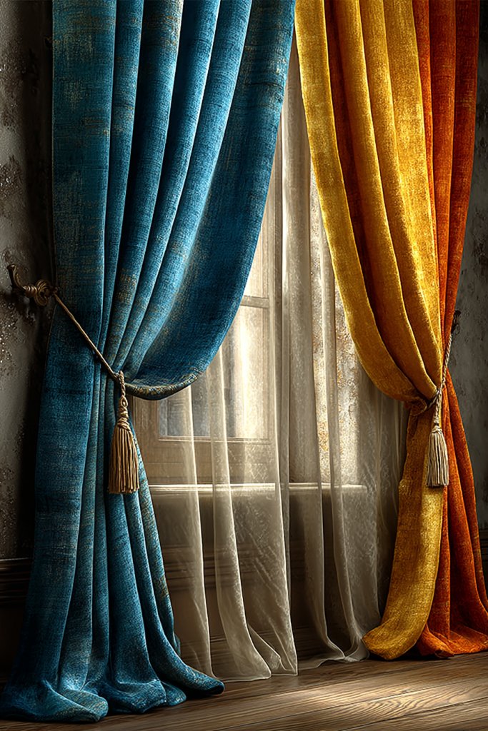 Imagine sheer, lightweight curtains in a subtle hue layered with heavier, patterned drapes in a rich color or bold print. The combination creates a dynamic interplay of textures and transparency, softening the room’s overall look. Play with different lengths—floor-length or slightly puddled—for added drama. The layers catch and diffuse light beautifully, creating a cozy, inviting atmosphere. The visual effect is both elegant and playful, depending on your choices.
