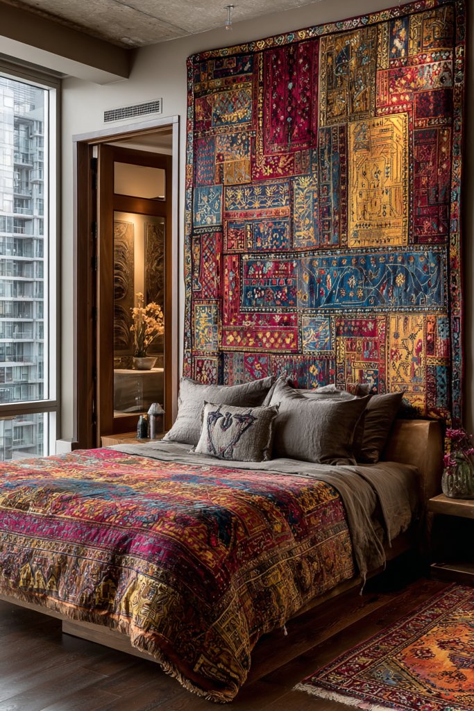 Imagine a large, vibrant textile with intricate patterns or abstract designs draped across a blank wall. Or a series of smaller woven or embroidered pieces arranged in an eclectic gallery. The textures—fringes, embroidery, weaving—add tactile richness and visual depth. Rich colors and bold patterns create a focal point that draws the eye and adds personality. The fabric’s movement and texture soften the space, making it feel cozy and curated.
