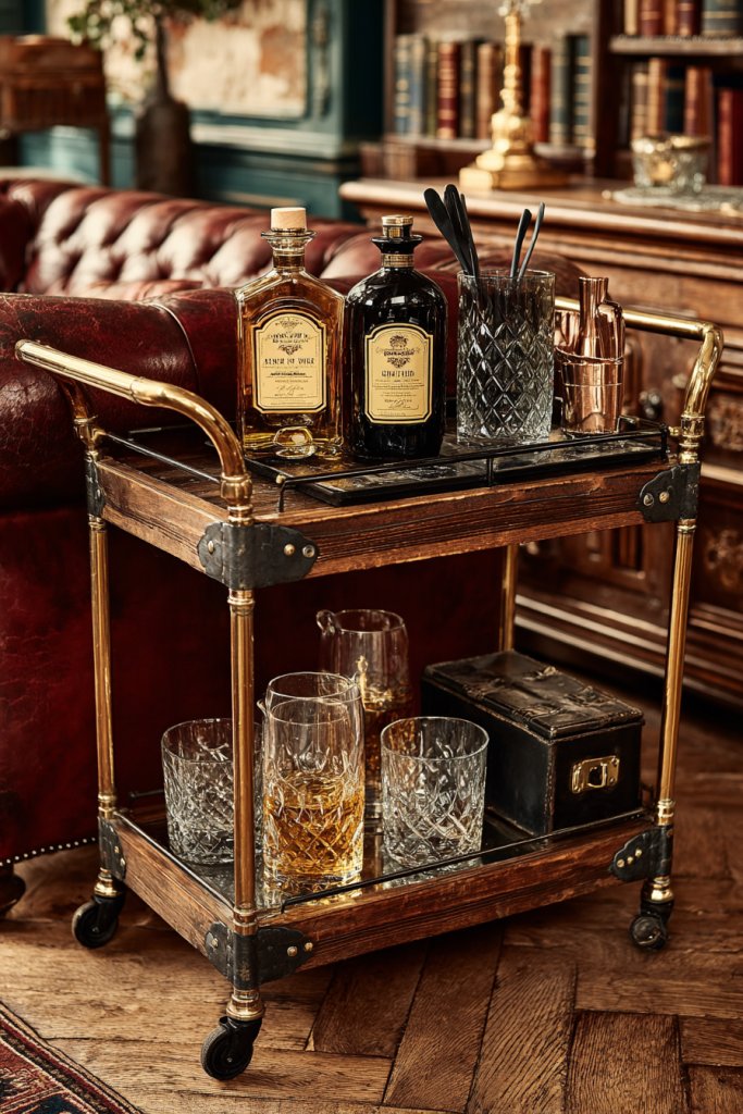 Picture a gold-framed vintage cart filled with colorful glassware, a decanter, and a few curated bottles. Or an ornate wooden antique with intricate carvings, topped with a tray of curated beverages. The cart becomes a focal point, blending nostalgia with modern flair. Decorative trays, vintage decanters, and mismatched glasses add layers of interest. The overall effect is chic, functional, and full of personality.