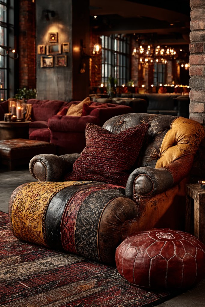 Imagine a cozy corner with a vintage armchair, a colorful pouf, and a sleek modern bench—all arranged casually around a coffee table. Or a dining area with mismatched chairs—some upholstered, some wood, some metal—adding personality and charm. Textures and colors vary, but they complement each other, creating a lively, lived-in feel. The mix invites you to sit, linger, and feel at home.